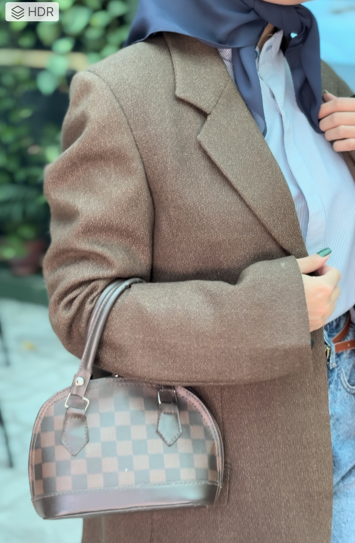 کت قهوهای که با شومیز آبی و شلوار جین سورمهای استایل شده.. یه ترکیب متفاوت🤎✨